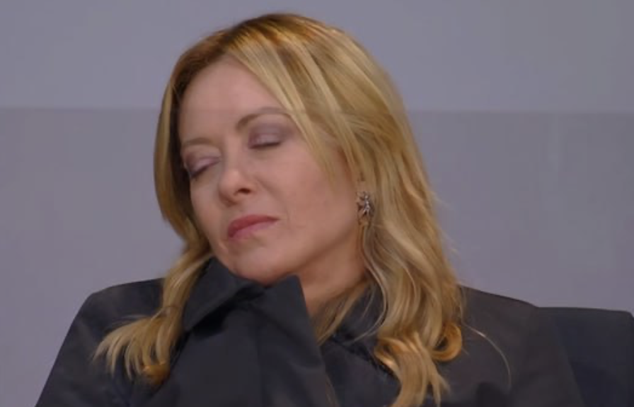 На записи видно, как Мелони наблюдает за происходящим с усталым видом, а затем на несколько секунд закрывает глаза, слегка склонив голову.